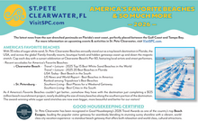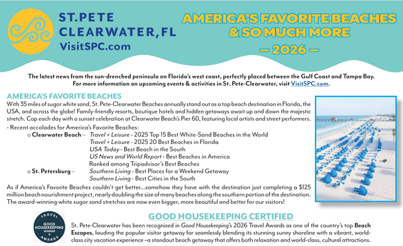 AMERICA'S FAVORITE BEACHES With 35 miles of sugar white sand, St. Pete-Clearwater Beaches annually stand out as a top beach destination in Florida, the USA, and across the globe! Family-friendly resorts, boutique hotels and hidden getaways await up and down the majestic stretch. Cap each day with a sunset celebration at Clearwater Beach's Pier 60, featuring local artists and street performers. - Recent accolades for America's Favorite Beaches: o Clearwater Beach – Travel + Leisure - 2025 Top 15 Best White-Sand Beaches in the World Travel + Leisure - 2025 20 Best Beaches in Florida USA Today - Best Beach in the South US News and World Report - Best Beaches in America Ranked among Tripadvisor's Best Beaches o St. Petersburg – Southern Living - Best Places for a Weekend Getaway Southern Living - Best Cities in the South As if America's Favorite Beaches couldn't get better...somehow they have with the destination just completing a $125 million beach nourishment project, nearly doubling the size of many beaches along the southern portion of the destination. The award-winning white sugar sand stretches are now even bigger, more beautiful and better for our visitors!